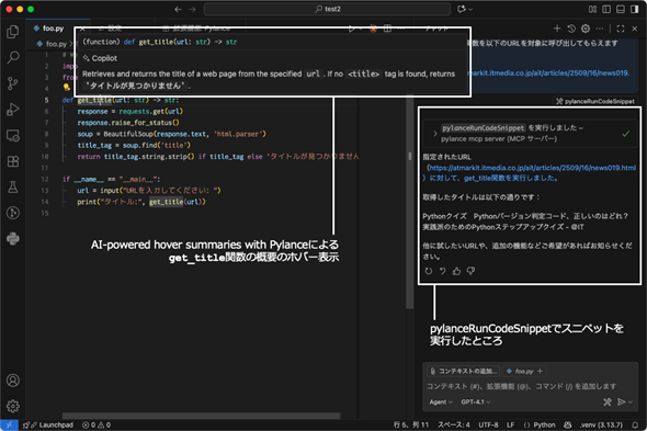 1つ目のAI-powered hover summaries with Pylanceは、AIがコードの概要を自動で要約する機能のこと。これまでの開発では、自分で書いたコードでも時間がたつと内容を忘れてしまいがちだったが、新しい機能を使えば、ドキュメントがない部分でも、AIがそのコードが何をするものなのかをマウスカーソル位置にホバーの形で表示してくれる。