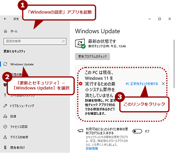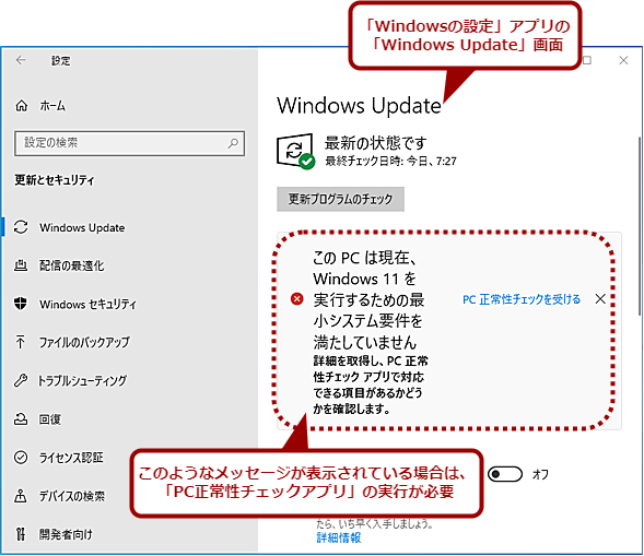 「Windowsの設定」アプリの「更新とセキュリティ」−「Windows Update」画面を開くと、以下のような画面が表示されている場合は、「PC正常性チェックアプリ」で上表のような要件に適合しているかどうかをチェックしていない状態だ。この場合、[PC正常性チェックを受ける]リンクをクリックする。