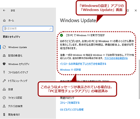 「Windows Update」画面でWindows 11に移行できるか確認する(1)ちなみに「PC正常性チェックアプリ」で要件の適合がチェック済みの場合は、以下のような画面が表示される。この場合は改めて「PC正常性チェックアプリ」を実行する必要はない。