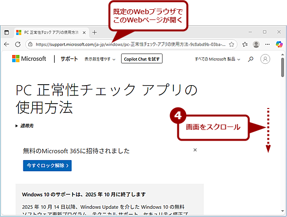 「Windows Update」画面でWindows 11に移行できるか確認する(2)[PC正常性チェックを受ける]リンクをクリックすると、Microsoftの「PC正常性チェックアプリの使用方法」ページが開くので、このWebページの中ほどにある「https://aka.ms/GetPCHealthCheckApp」リンクをクリックしてインストーラー「WindowsPCHealthCheckSetup.msi」をダウンロード、これを実行してインストールすればよい。
