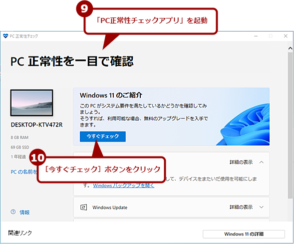 「PC正常性チェックアプリ」を起動すると、「PC正常性を一目で確認」画面が表示されるので、ここの「Windows 11のご紹介」欄にある[今すぐチェック]ボタンをクリックすれば互換性のチェックが実行される。「このPCはWindows 11の要件を満たしています」と表示されれば、Windows 11へのアップグレードが可能だ。