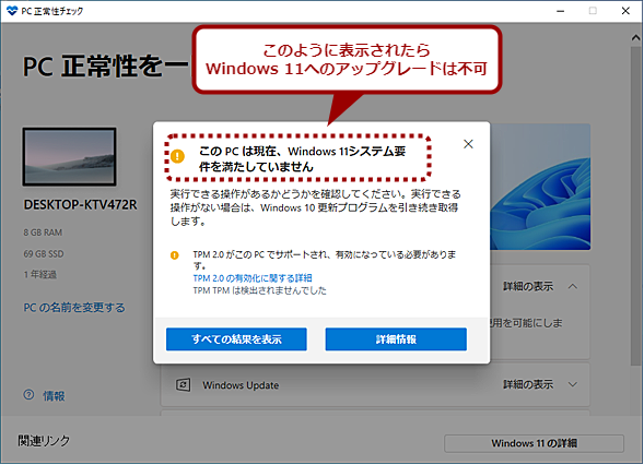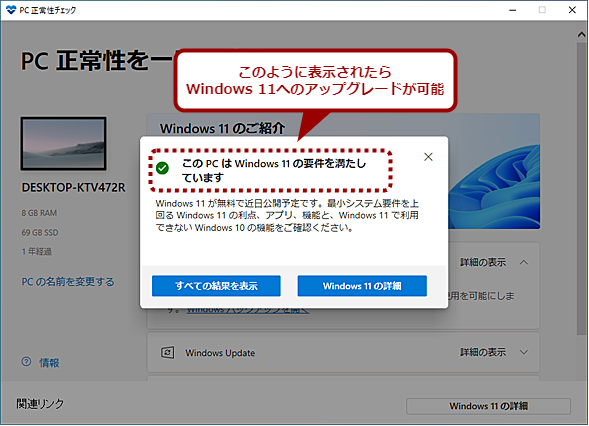 このように設定変更やハードウェア増強をしたら、再度、「PC正常性チェックアプリ」を実行して、チェックをパスするかどうかを再確認すればよい。直したはずの項目のせいでまだチェックにパスしない場合は、1日ほど待ってから再度チェックしてみよう。