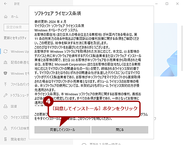 「Windows Update」画面が「Windows 11,version 24H2の準備ができました」と表示が変わっているはずだ(場合によっては、「PC正常性チェックアプリ」の確認後、このメッセージが表示されるまで時間がかかることもある)。このメッセージの下に[ダウンロードしてインストール]ボタンが表示されているはずなので、これをクリックするとソフトウェアライセンス条項の同意を求めるダイアログが表示されるので、[同意してインストール]ボタンをクリックする。