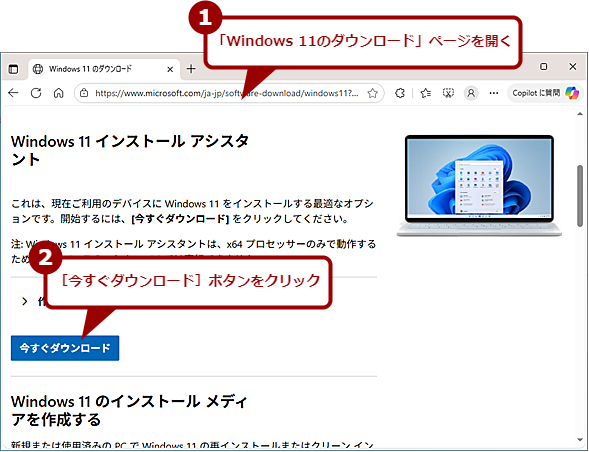 インストールアシスタントを利用してアップグレードしたい場合は、Microsoftの「Windows 11 のダウンロード」ページを開き、「Windows 11インストールアシスタント」欄の[今すぐダウンロード]ボタンをクリックして、インストールアシスタントのインストーラー「Windows11InstallationAssistant.exe」をダウンロードする。これを実行すると、[Windows 11インストールアシスタント]ウィザードが起動するので指示に従って進めていけばWindows 11にアップグレード(インストール)できる。