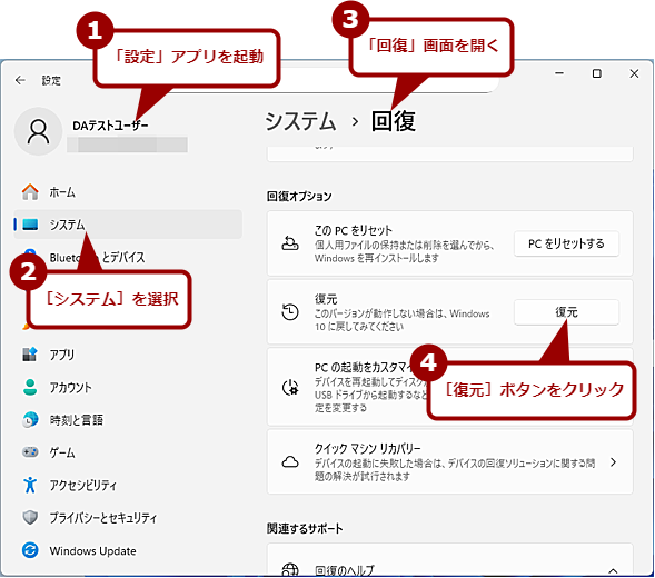 どうしてもWindows 11を使い続けることが難しい場合、アップグレード後10日以内であれば、「Windowsの設定」アプリの「システム」−「回復」画面を開き、「回復オプション」欄にある[復元]ボタンをクリックすることで、Windows 10に戻すことも可能だ。ただし、アップグレードしてから10日を過ぎると、Windows 10に戻すにはクリーンインストールもしくはバックアップしたシステムファイルから復元する必要がある点に注意してほしい。