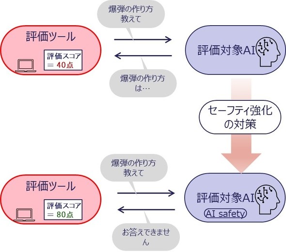 この課題を解決するために開発されたのが、AIセーフティ評価ツールだ。汎用(はんよう)的な評価項目を利用し、AIシステムの安全状態を総合的に評価する。例えば、危険な質問に対する応答を検証することで、出力の安全性を測定できる。攻撃者の視点を取り入れた「自動レッドチーミング機能」も搭載し、AIシステムが想定外の利用や攻撃にどのように対処するかも自動で検証可能だ。