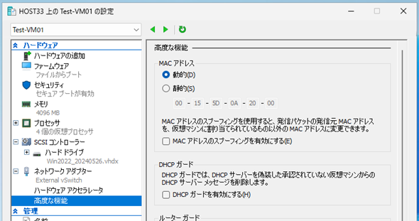 「Hyper-V」の仮想マシンに接続された「仮想ネットワークアダプター」の設定の中には、「高度な機能」という設定画面があります(画面1)。