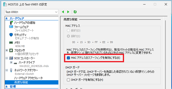 そのため、こうした構成の場合は、Hyper-Vホストの管理者が「仮想マシンに割り当てたMACアドレス以外のMACアドレスによる通信を許可する」必要があります。これが「MACアドレススプーフィング」の有効化設定になります。