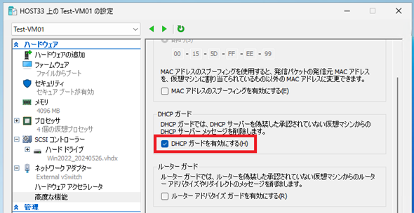 Hyper-V上の仮想マシンでDHCPサーバを稼働させる予定がない場合は、Hyper-Vホストの管理者側で本機能を有効化することで、予期しないDHCPサーバ由来のトラブルを避けられるでしょう。