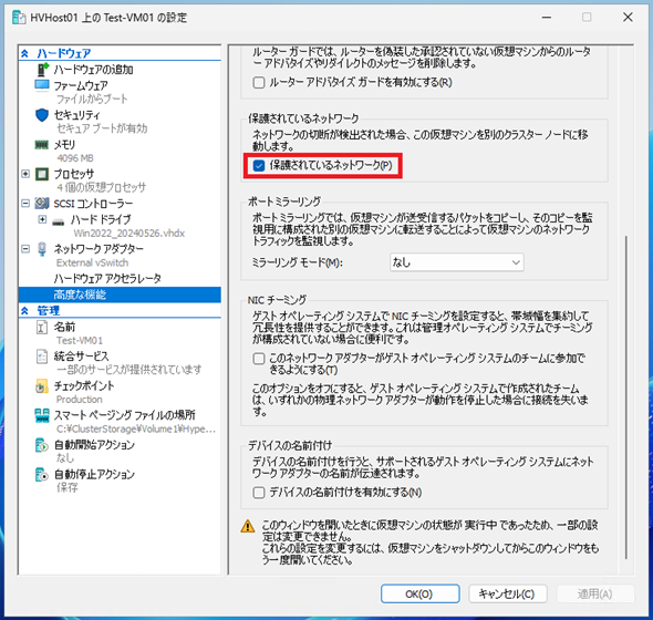 「保護されているネットワーク」の設定は、そうした事象が発生した際に高可用性構成(クラスタ)を組んでいる他のHyper-Vホストへ自動移動するかどうかの設定となります。
