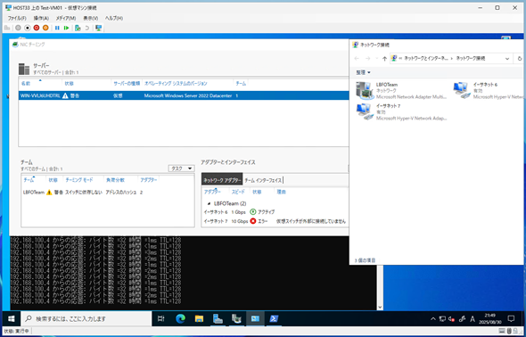 本設定を有効化した仮想マシンで、同じようにチームに参加しているネットワークアダプターが接続している仮想スイッチのアップリンクで障害を発生させましたが、他方の仮想ネットワークアダプターで通信が引き継がれてネットワーク断が発生しないことが確認できました(画面18)。