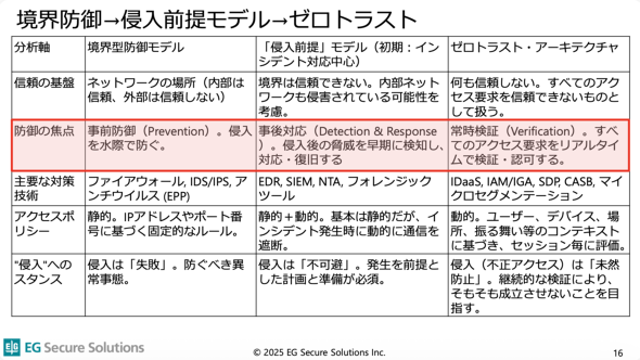 これは、従来の境界型防御が「内部は信頼、外部は信頼しない」という単純なモデルだったのに対し、ゼロトラストは「全てのアクセス要求を信頼できないものとして扱う」という、より厳格な姿勢を示している。防御の焦点も、事前防御から、侵入後の脅威を早期に検知して対応・復旧する事後対応、継続的な検証によって不正アクセスを未然に防ぐ「常時検証」に変化している。