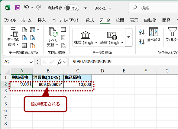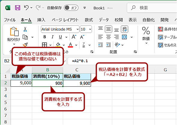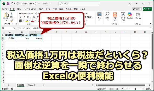 逆算の元となる数式が入力された表を用意する。ここでは「A2」セルに税抜価格、「B2」セルに消費税(10%)を計算する数式「=A2*0.1」、「C2」セルに税込価格の数式「=A2+B2」をそれぞれ入力する。この時点では、「A2」セルに入力する税抜価格は仮の数値で構わない。