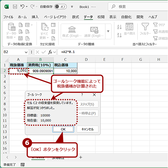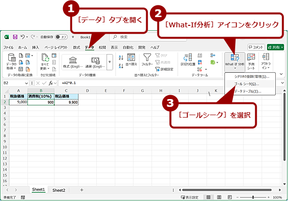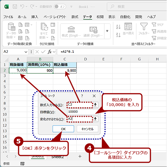 ここでは「税込価格を1万円にするための税抜価格」を求める手順を例にゴールシーク機能の基本的な使い方を解説しよう。