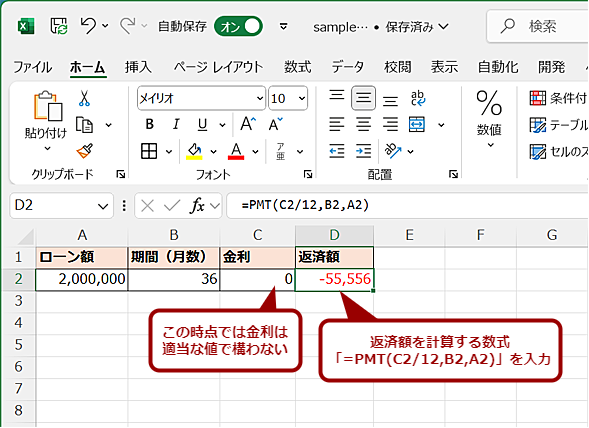 税抜価格を計算したのと同様、逆算の元となる数式が入力された表を用意する。ここでは「A2」セルにローン額、「B2」セルに期間(月数)、「C2」セルに金利、「D2」セルに返済額の数式「=PMT(C2/12,B2,A2)」を入力する。この時点では、「C2」セルの金利は入力しなくてよい(「0」でよい)。