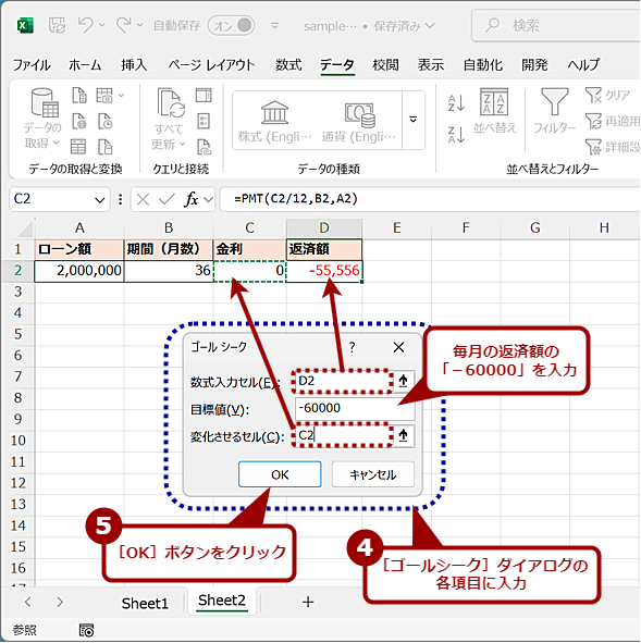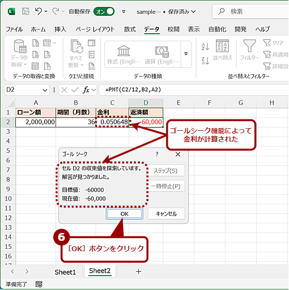 [OK]ボタンをクリックすると、Excelが自動で「C2」セルに入力すべき金利の値を計算してくれる。計算が完了すると、[ゴールシーク]ダイアログが表示され、「C2」セルの値が「0.050648(約5%)」に、「D2」セルの値が目標の「-60,000」に変わっていることが確認できる。この結果が正しければ、[OK]ボタンをクリックすると、値が確定される。元の値に戻したい場合は、[キャンセル]ボタンをクリックすればよい。