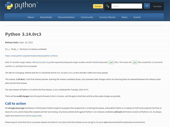 2025年10月7日のPython 3.14.0のリリースに向け、最後のRC(リリース候補版)となるPython 3.14.0rc3がリリースされた。この後は明らかなバグの修正のみが行われる。