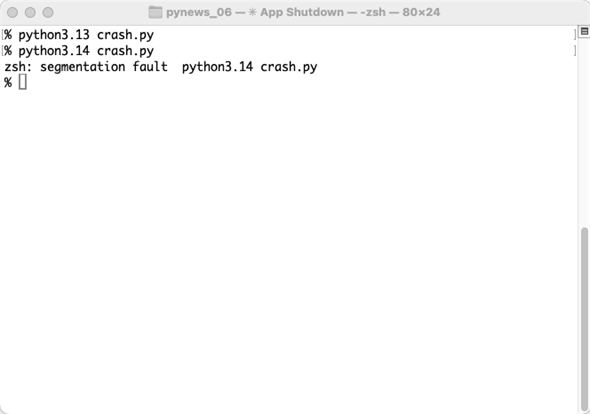 しかし、Python 3.14.0rc2で、このコードを実行するとセグメンテーションフォールトが発生する。