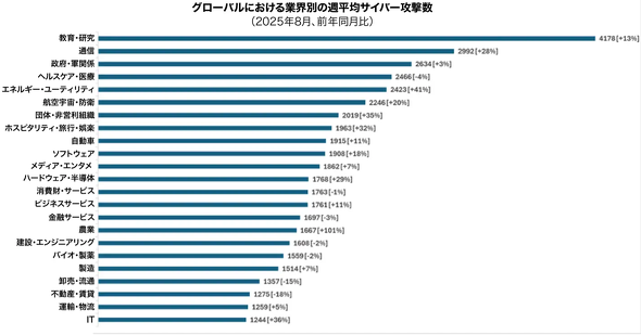 業界別では、教育・研究が依然として最多で、1組織当たり週平均4178件(前年比13%増)の攻撃を受けた。通信も前年比28%増の2992件に達し、政府機関も2634件と増加傾向を示した。特に農業は前年比101%増と急伸しており、CPRは自動水利システムやIoTセンサー、ドローンなど先端技術に依存する一方で、サイバー防御への投資が不足しており、脅威アクターにとって魅力的な標的になっていると分析している。食料生産を妨害することは、経済的打撃や食の安全保障への脅威に直結するリスクを持つことから、地政学的に利用される懸念も示している。