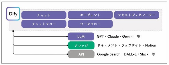 図のように、DifyはLLMやGoogleなどの検索エンジンや、SlackなどのチャットツールとAPI連携することにより、さまざまななアプリを開発することができます。