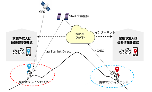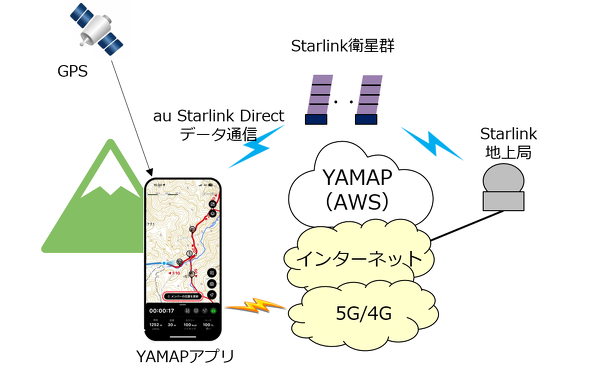 登山者の位置情報は、3分置きにアプリから「Amazon Web Services」(AWS)上のYAMAPサーバに送られる。これまではスマホの電波が入る場所でしか位置情報を送信できなかったが、au Starlink Directデータ通信を使うことで、空が開けている場所ならほとんどのところから位置情報を送れるようになった。送る情報は位置情報が主だ。情報量が少ないので低帯域は問題にならない。通信が不安定でも3分置きにリトライするので大きな支障にはならない。
