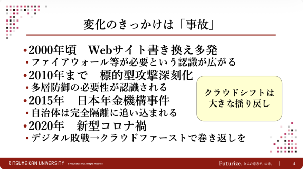 特に公共における情報システムの歴史について、上原氏は「公開時代」(1990年代)、「ファイアウォール時代」(2000年ごろ)、「多層防御時代」(2010年ごろ)、「隔離時代」(2015年ごろ)、そして「クラウド、ゼロトラスト時代」(2020年ごろ)の5つの時代に分ける。注目すべきは、これらの時代の移り変わりは、ほとんどが「事故」をきっかけに起きていることだ。