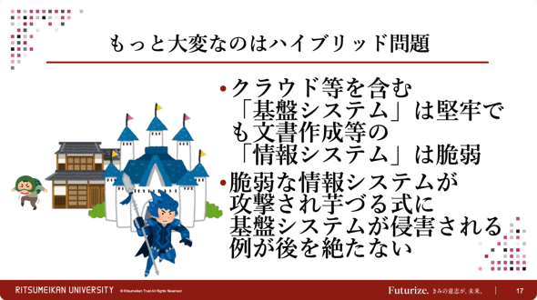 加えて、「ハイブリッド」システムの問題も深刻だ。多くの組織では、昔ながらのオンプレミスシステムと新しいクラウドシステムを併用しており、セキュリティ対策が不十分な「情報システム」側が攻撃され、そこを足掛かりに「基幹システム」まで侵害される事例が後を絶たない。