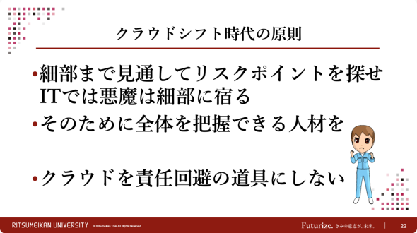 上原氏は、「ITの分野では、細部に宿るのは神ではなく“悪魔”だ。その細部から侵入されることで全体が崩れることを肝に銘じ、最後まで全てを見通せるような人材が必要不可欠だ」と強調した。クラウドを「責任回避の道具」とせず、「クラウドとオンプレミスのつなぎ目や、ユーザーが利用するサービス設定の中に潜むリスクを自ら見極められる人材の育成と配置が、クラウドシフト時代のセキュリティ確保には最も重要だ」と結んだ。