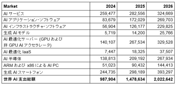 Gartnerは、AI技術がスマートフォンやPCといった製品や基盤インフラに組み込まれることで、2026年にはAI支出が2兆ドルを超えると予測している。