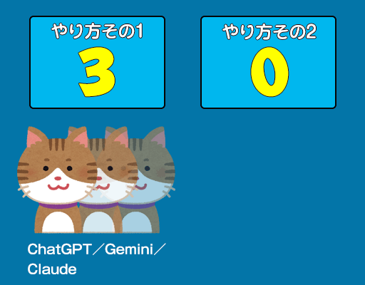 筆者は問題文のコードをよりスマートにPython風に書く案として2つのやり方を考えました。しかし、それらには一長一短があるかなと思い、どちらが適切かをChatGPT(GPT 5)/Gemini 2.5 Flash/Claude(Claude Sonnet 4)という3つの大規模言語モデル(LLM)に聞いてみました。その結果が以下です。