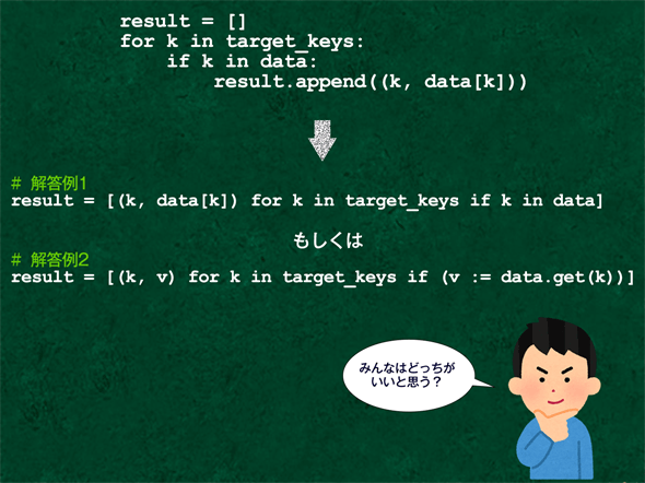 以下に示すコードにおいて、dataはキーと値の組を格納する辞書である。また、target_keysはdataからキーと値の組を抽出する対象となるキーを格納するリストだ。for文ではtarget_keysの要素を反復し、反復した値がキーとして辞書に存在するかどうかをチェックしている。キーとして存在していれば、その値を取得して、キーと値の組をタプルとしてresultに追加している。これは正しく動作するが、よりPython風な書き方が可能である。どんなコードが考えられるだろう。