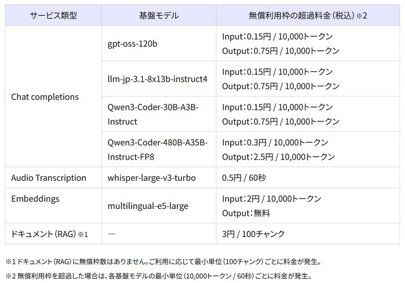 無料枠を超過する場合、基盤モデル無償プランではAPIリクエストに対するレート制限が発生し、従量課金プランでは1万トークンごとの課金となる。