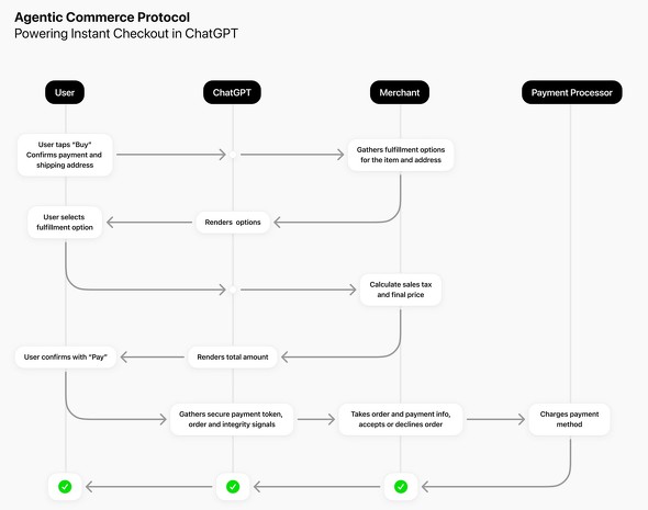 ChatGPTはユーザーのAIアシスタントとして機能し、ユーザーと加盟店の間で情報を仲介する。ユーザーが注文を行うと、ChatGPTはACPを通じて必要な情報を加盟店のバックエンドシステムに送信する。加盟店は注文を承認または拒否し、決済処理は既存の決済プロバイダーを通じて行われる。