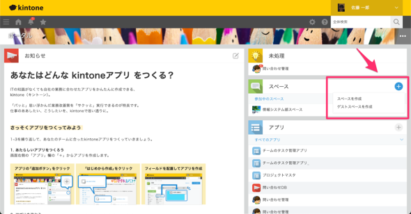 スペースを作成するには、kintoneのトップ画面右側のスペースの欄から[+]ボタンをクリックして、[スペースを作成]を選択します(図1)。