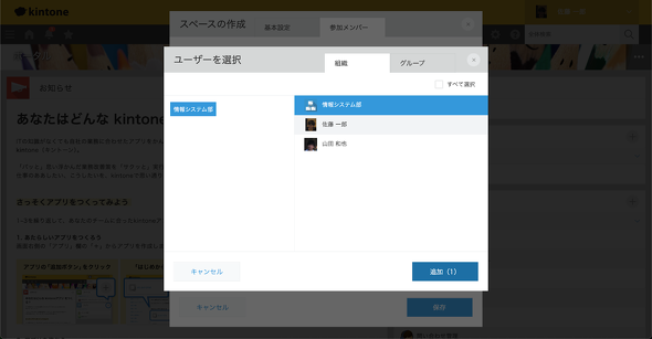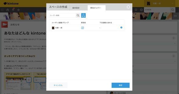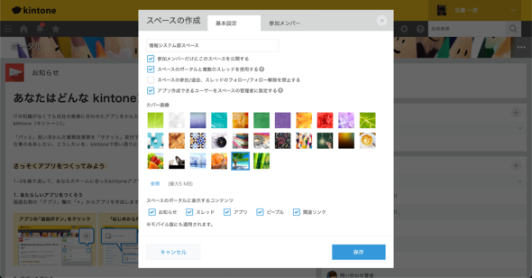 ここでは、これまでの回で作成してきた情報システム部向けのアプリをまとめる場所にしたいので、名前は「情報システム部スペース」とし、また、情報システム部員のみがアクセスできるように「参加メンバーだけにこのスペースを公開する」にチェックを入れています。
