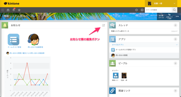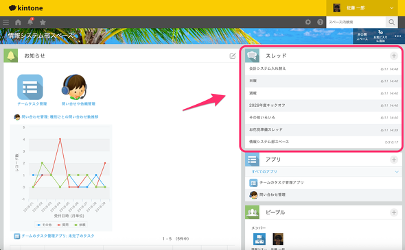 画面左側が[お知らせ]欄となっており、部門へのお知らせや「進捗グラフ」、各アプリへのリンクやアイコンなどを配置できます。ポータルとして使いやすいように工夫できる領域です。右側の[スレッド]はさまざまなトピックについてスレッドを切ってやりとりできる場所と、その下には、このスペースに設定されているスペース参加者が権限を持つアプリが表示されます。
