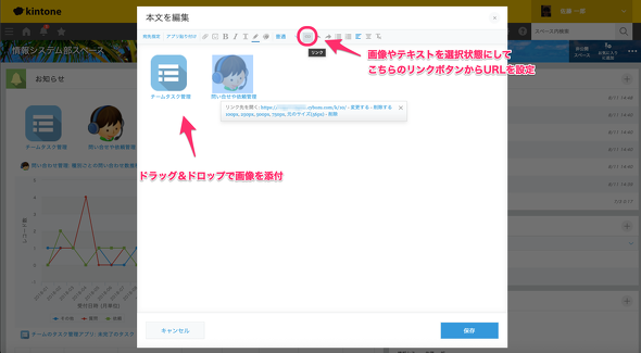 編集ボタンをクリックすると、[本文を編集]ダイアログが表示されるので、お知らせ欄に表示するコンテンツを編集していきましょう。