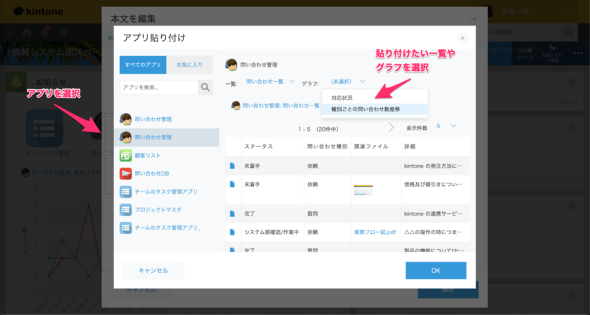 続いて、[本文を編集]ダイアログ上部の[アプリ貼り付け]のボタンから、問い合わせ対応の進捗グラフを追加します。アプリを貼り付けボタンをクリックすると、図9のように貼り付けたいアプリを選択して、レコード一覧を表示するのか、グラフを表示するのかを選択できます。