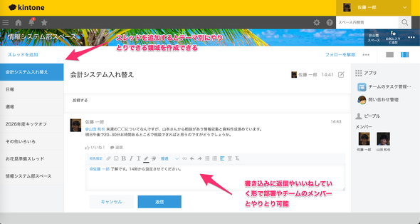 アプリのレコードにはコメント欄があり、タスクや案件など個別のレコードに関わるやりとりができました。それ以外のコミュニケーションを進めたり、広くオープンに情報共有したりする場合には、スペースの[スレッド]機能を利用できます。スレッドでは、部署やプロジェクトのトピックごとにテーマを分けて、情報を整理しながら意見を交換できます(図12)。