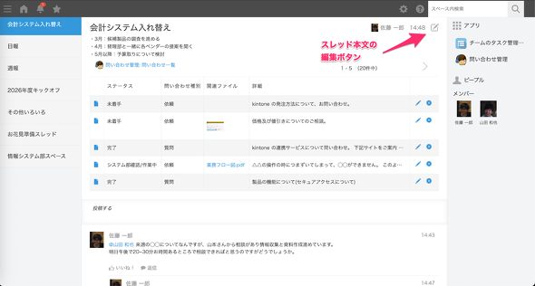 なお、スレッドの先頭には参照したい情報やアプリのデータも常に表示できます。各スレッドのトピックに関連する情報を見せるために活用するとよいでしょう。この部分を編集するには、スレッド画面右上の編集ボタンをクリックしてください(図14)。編集方法は、先ほどのお知らせ欄の場合と同じです。