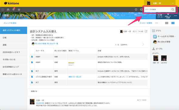 スペースにスレッドやアプリなどの情報が蓄積され増えてくると、情報を簡単に探せることも重要になります。そのようなときは、スペース画面の右上の検索窓からキーワードを入力して検索してみましょう(図15)。アプリのレコードやスレッドの書き込み、その他添付されているファイルなどを横断して検索できます。