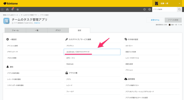 作成したプログラム(カスタマイズファイル)をアプリに設置する手順を見てみましょう。図18のように、チームのタスク管理アプリの管理画面から[JavaScript/CSSでカスタマイズ]をクリックします。