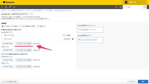 図19の画面で、先ほど作成したファイルをアップロードして追加します(URLで読み込むファイルを指定することも可能です)。これにより、設定したプログラムが指定のアプリで読み込まれ実行されるようになります。[保存]−[アプリを更新]と選択して、変更を反映します。
