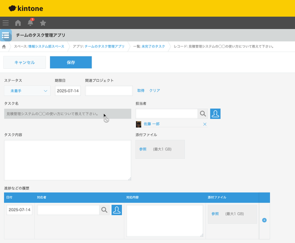 レコード編集画面を見てみると、図20のようにタスク名のフィールドがグレーアウトされています。追加したカスタマイズファイルが正しく動作していることが確認できます。