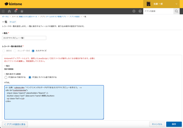 さらに独自の画面を開発することができる機構も各アプリに用意されています。[カスタマイズビュー]という機能です。各アプリの一覧設定から図21のように表示形式をカスタマイズビューに選択するとHTMLを記述できます。