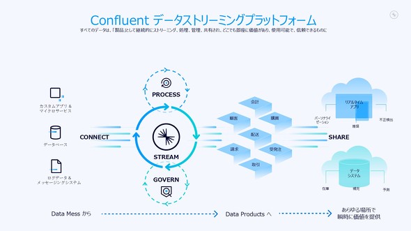Confluentの製品には、オンプレミスの「Confluent Platform」とクラウドサービスの「Confluent Cloud」が用意されており、環境や用途に合わせて自由に組み合わせるハイブリッド構成にも対応する。機密性の高い基幹データはオンプレミスで処理し、加工済みの安全なデータのみをクラウド分析プラットフォームにリアルタイムで送信するといった柔軟な運用が可能だ。データサイロの解消にも貢献できる。