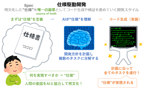 最初に「何を実現すべきか」を“仕様”として明文化し、それを唯一の基準としてコード生成や検証を進めていく新しい開発スタイル。人間の意図を表した“仕様”が基準となるため、“雰囲気”を重視するバイブコーディングよりも高精度な開発が可能。