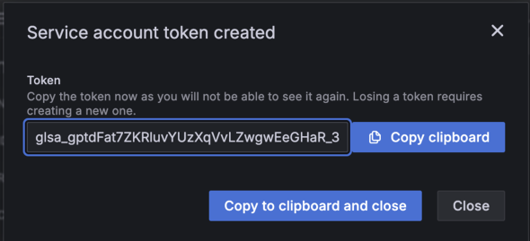 Grafanaの接続URLと、先ほど取得したGrafanaのAPIキーを環境変数で設定します。