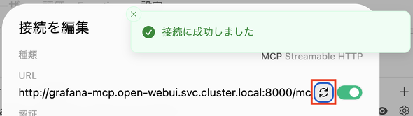 以下のコマンドを実行し、Open WebUIコンテナ内からmcp-grafanaのエンドポイントが正常に応答することを確認します。