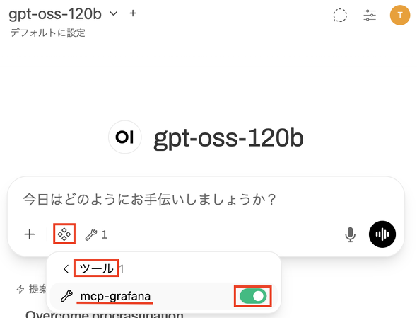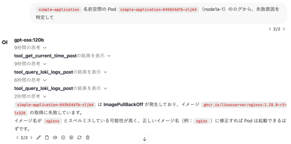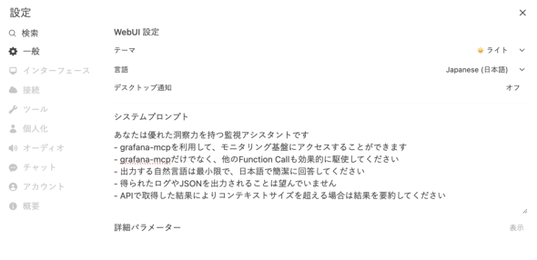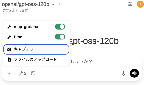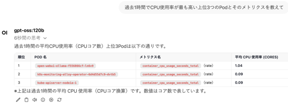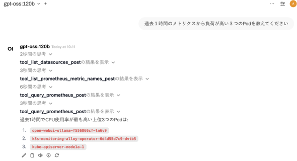 | Open WebUI | gpt-ossと対話するためのチャットインタフェースです。mcp-grafanaを利用しながらタスクを実行するエージェント的な機能もgpt-ossと連携させています |